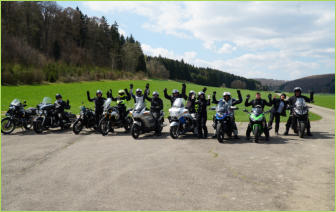 Teilnehmer mit Aufwärmübungen auf dem Motorrad. Anschließend